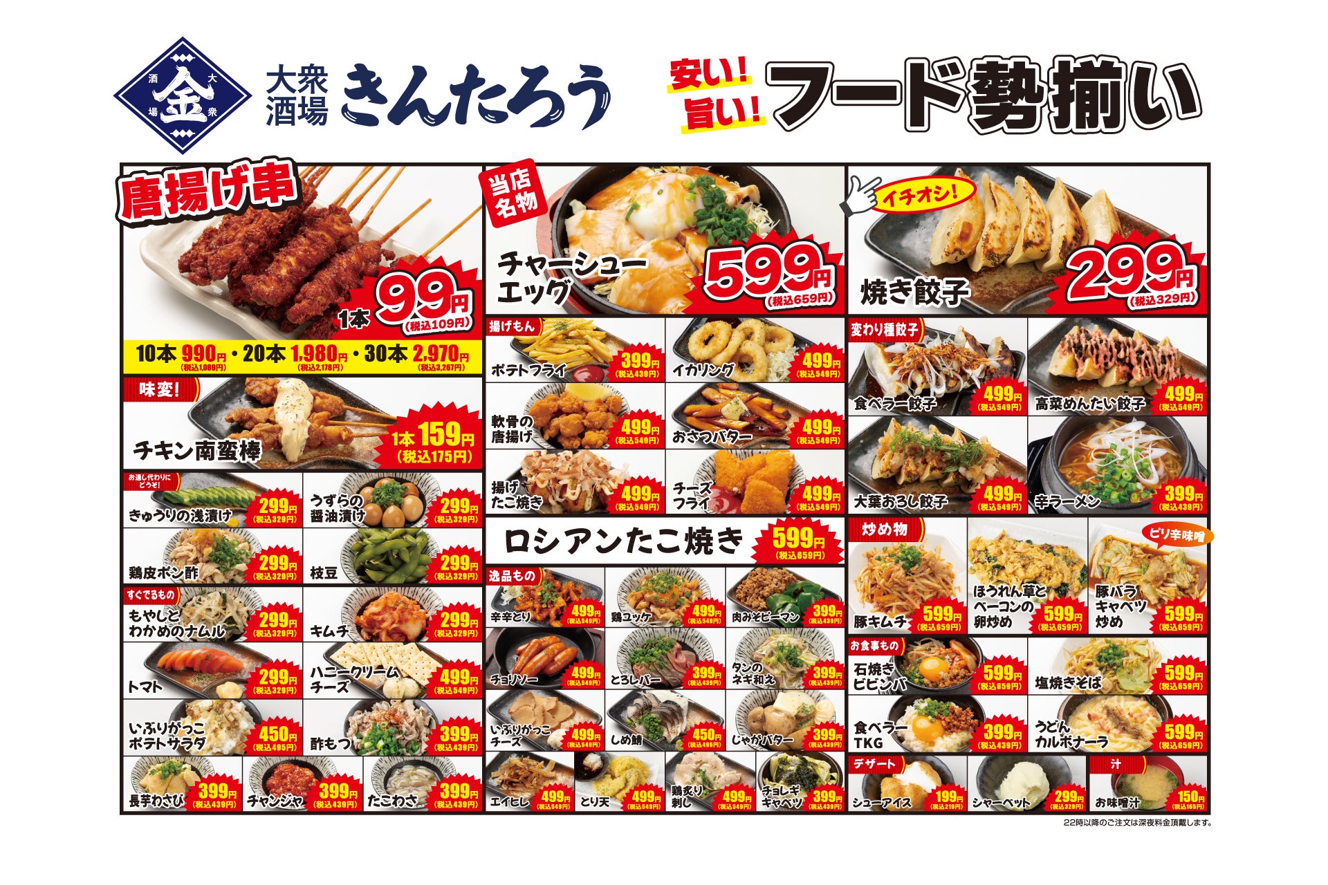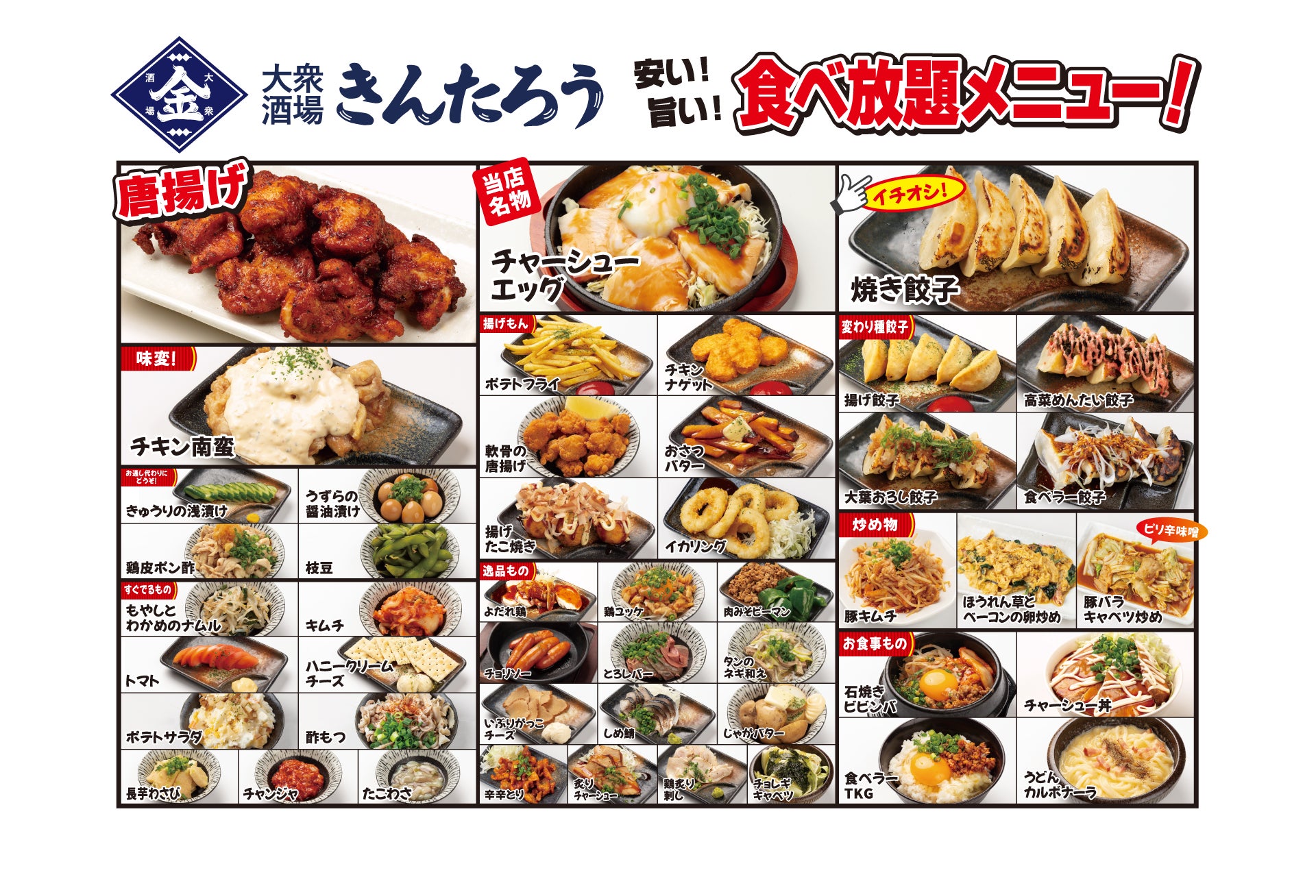 新ブランド「きんたろう」でも食べ放題システムを導入。唐揚げや揚げ物はもちろん、半熟たまごがとろりと旨い「チャーシューエッグ」やいろいろな味を試せる餃子類、たくさんのおつまみ逸品、本格的な石焼ビビンバなどのお食事ものまで、全47品・2時間制の食べ放題を税込2980円でご提供します。