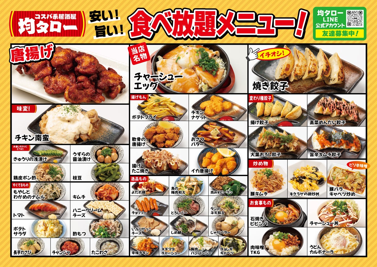 50種以上の豊富なフードメニューとドリンクが激安で大好評のコスパ系居酒屋・均タローは普段使いがしやすく特に若者から人気のブランドです。グループでもご利用しやすい予約なしで当日注文OKの激安・食べ飲み放題コース(2980円~/税込)や、当社創業から累計50万本販売のオリジナル唐揚げ「金から串」が名物。神奈川県平塚市・JR平塚駅(徒歩4分)に新規開店する平塚店は、「お通しなし・席料0円」の料金システムで気軽にご利用になれ、「これぞコスパ系!」を感じていただける店舗です。