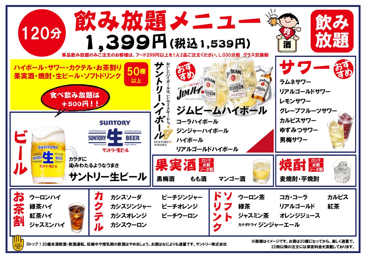 予約不要・当日注文OKの、大人気・食べ飲み放題メニュー