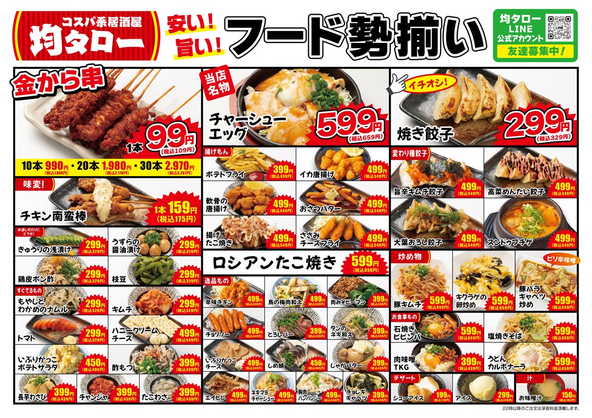 平塚店の新規開店を記念し7月13日(日)より3日間、名物「金から串」を1本50円(税込55円)のオープニングキャンペーンを開催します。コスパよく豊富なメニューを楽しめる、いつもの日常がもっと楽しくなる激安コスパ系居酒屋・均タロー 平塚店へぜひお越しください!