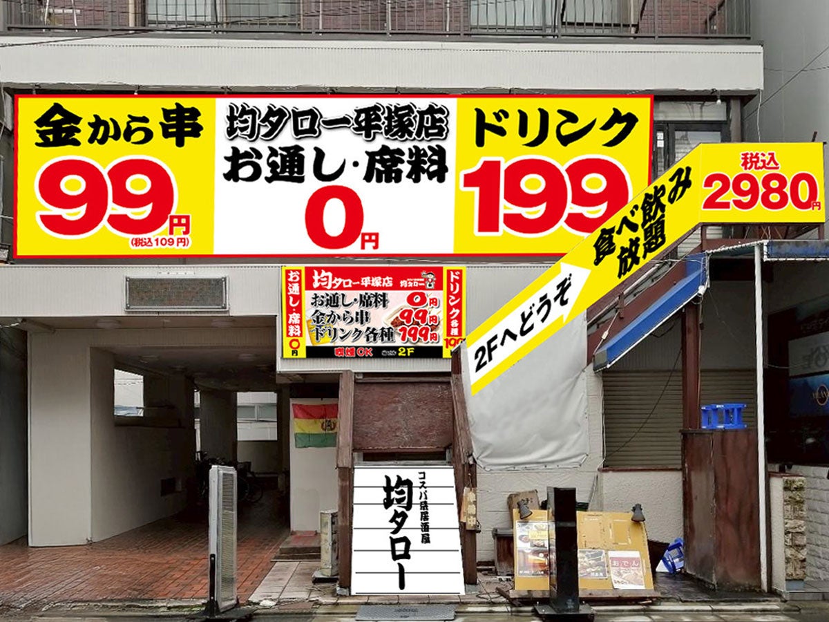 お通し・席料0円、食べ飲み放題は2980円(税込)の激安コスパ系居酒屋が平塚に上陸、金から串が1本50円のオープニングキャンペーンもやってくる!